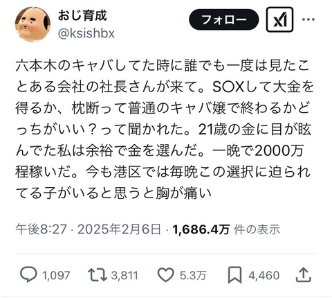 【悲報】X女子「キャバ嬢やってた時に一晩2000万円で枕した記憶、今もこれされてる子がいると思うと胸が痛い…」