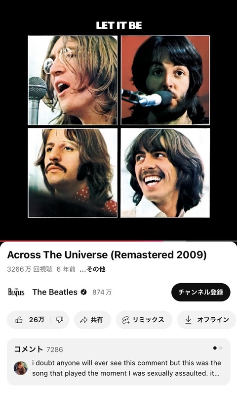 【悲報】ワイ、YouTubeでビートルズの動画見てたらコメント欄にレ●プされた人がいるのを見つける