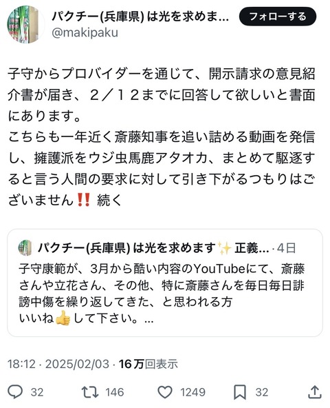【特大悲報】斎藤元彦支持者さん、遂に開示請求される…「断固戦う!安く仕事してくれる弁護士を探します」