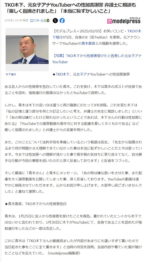 【悲報】TKO木下さん、青木歌音さんとの一件を弁護士に相談するも「あなたの行動は性加害です」と説教される