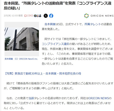 【悲報】吉本興業、一部タレントの活動自粛発表