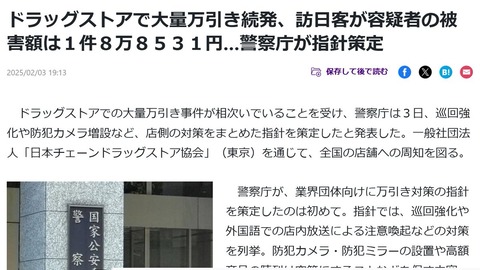 【悲報】訪日外国人の万引き被害額がエグすぎる、1件当たりの被害額の平均8万8531円