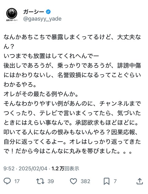 【朗報】ガーシー「暴露してる人多いけど、誹謗中傷やし名誉毀損になるぞ。承認欲求もほどほどにな」