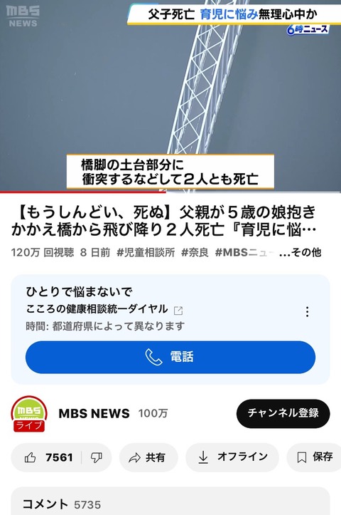 【もうしんどい、●ぬ】父親が5歳の娘抱き抱え橋から飛び降り2人死亡