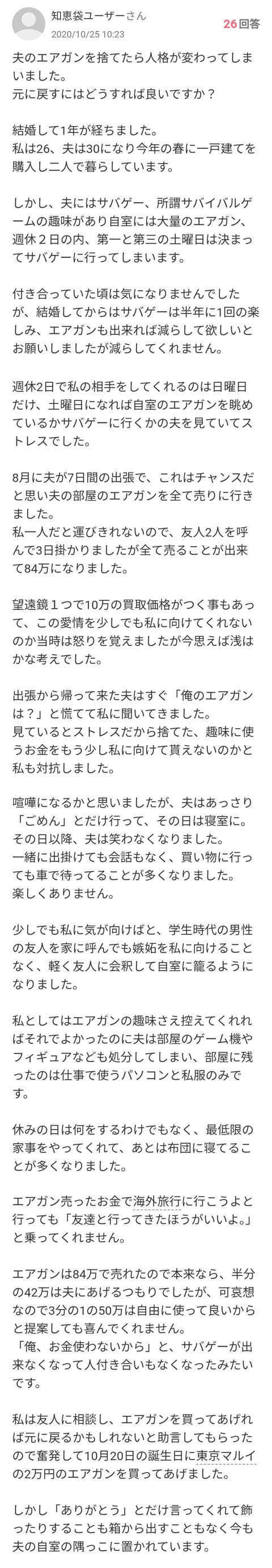 【悲報】知恵袋ユーザーさん「夫の趣味のエアガンを全部売り払ったら人格が変わってしまいました」