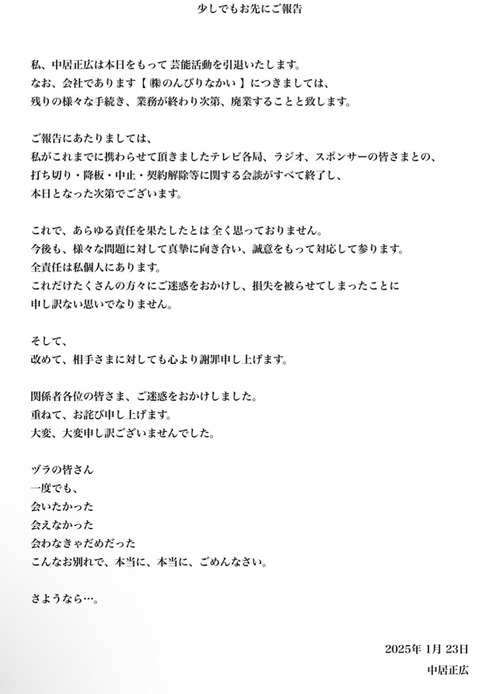 【悲報】中居「なお示談が成立したので芸能活動についても支障なく続けられることになりました」→「会いたかった 会えなかった 会わなきゃだめだった ごめんなさい。さようなら…。」