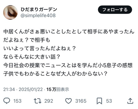 【正論】小5男子「中居くんが謝って相手もいいよって言ったんだよねぇ?そんなに大きい話?」