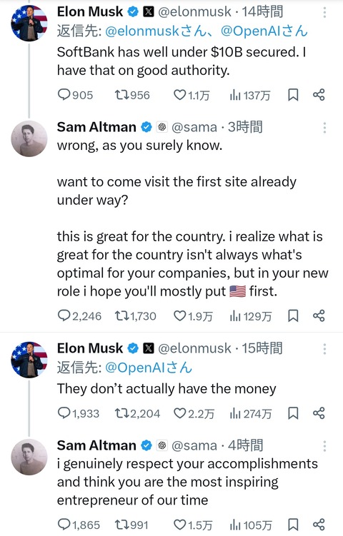 【悲報】孫正義「AIインフラに4年間で78兆円を投資する」イーロン「そんな金無いだろ」
