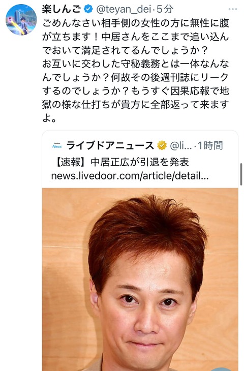 【悲報】楽しんごさん、中居正広引退でX子に憤怒